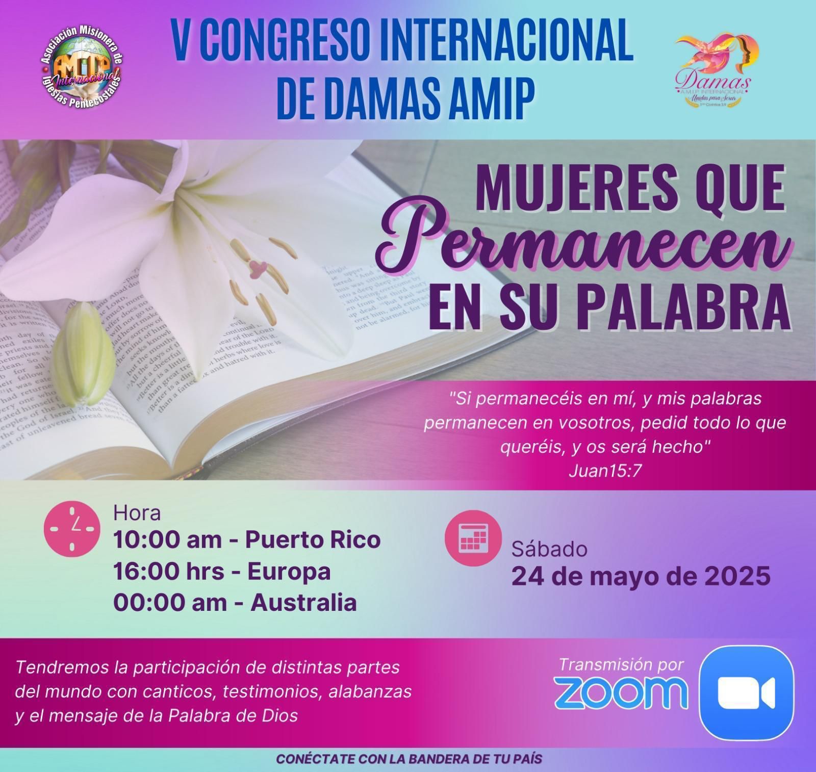 La Asociación Misionera de Iglesias Pentecostales (AMIP), a través de su Directiva Internacional de Damas, extiende una solemne convocatoria al V Congreso Internacional, bajo el lema: "Mujeres que permanecen en Su Palabra", basado en Juan 15:7. Una cita espiritual global por Zoom, con voces de distintas naciones, adoración y el mensaje eterno de las Escrituras.